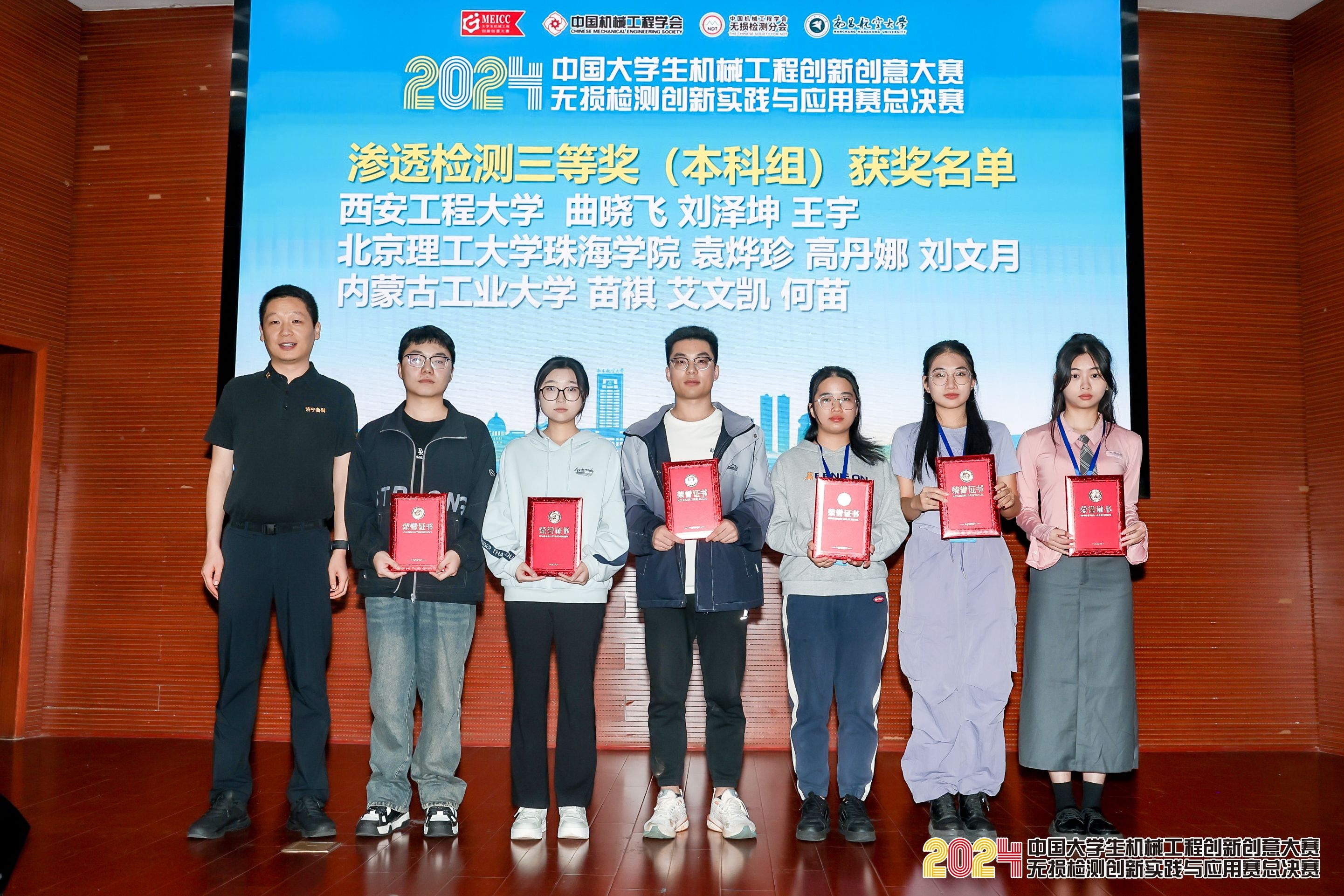 大賽頒獎環節,濟寧魯科薛建祥總經理為滲透檢測獲獎學生頒獎,并合影留念。