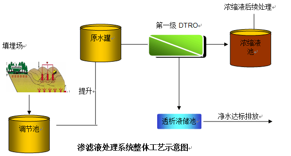 調(diào)節(jié)池滲濾液經(jīng)泵提升至滲濾液原水儲罐,進行pH值調(diào)節(jié)、砂濾器、保安過濾器等簡單預處理后,進入單級DTRO,經(jīng)DTRO處理后產(chǎn)生的透過液排放,DTRO的濃水排至濃縮液儲池等待進一步處理DTRO工藝整體處是流程如下圖所示: